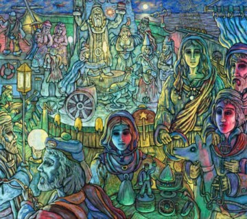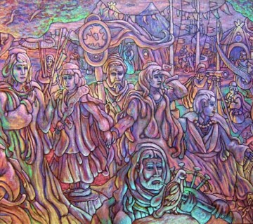 There is an atmosphere of enchaniment that permeales Robert Kamczura´s acrylic paintings, as if he opens window into timeless worlds where mundane assumes the aura of magic an theater. Like character in a costume play, the men in his paintings have full beard and wear robes or tunics. The women are dressed in diaphanous gowns. His lighting, which exudes an otherworldly glow, is dramatic and stage-like, accentuated by a kind of broken color thet is alternately warm and cool.